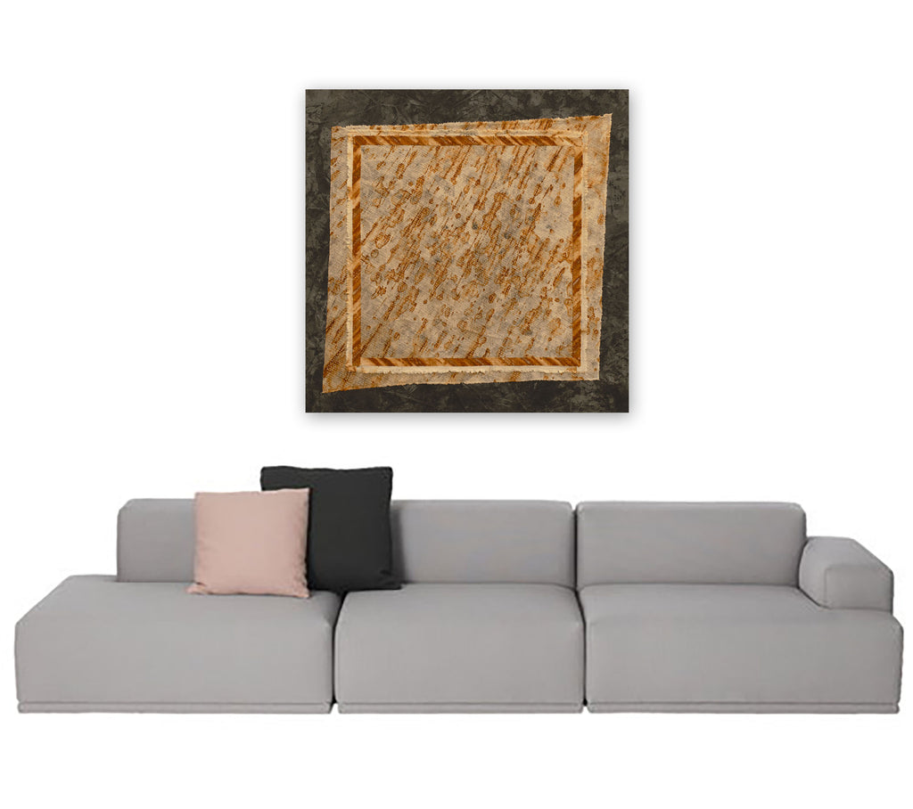 The rich iron oxide patina of this piece is created using rusty metal placed on wet canvas to create interesting marks. Iron is a grounding element, and the very core of our planet is composed of molten iron. The iron art keeps us connected to the Earth plane, has a grounding influence, and evokes a sense of safety, security, stability and well-being.