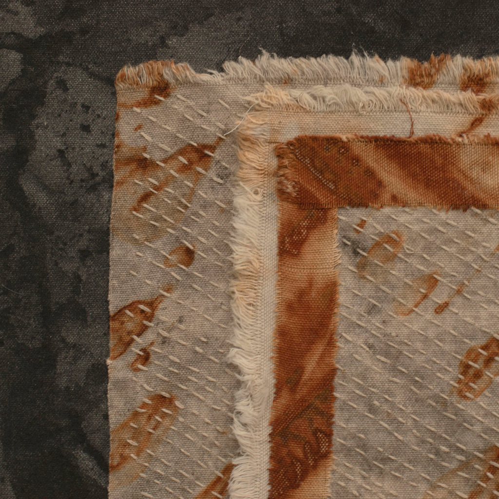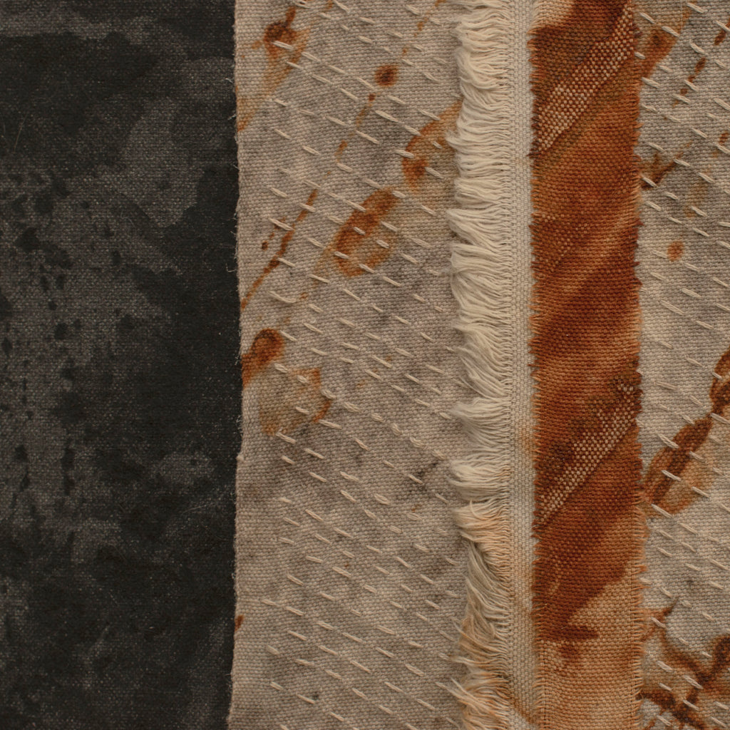 The background painting was done with bone black powder and soy milk to bind the dry pigment to the canvas. The center piece was created using rust and eucalyptus leaves on canvas with contemplative hand stitching to accent the design and give it texture.